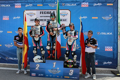 San Luis Potosí vibro y fue parte de la historia del motociclismo al recibir al único campeonato exclusivo para damas en el mundo, la Italika Women´s World Cup que dejó grandes momentos sobre la pista del Autódromo Tangamanga siendo la gran vencedora la piloto mexicana Astrid Madrigal al mando de la Italika Vort-X 650cc #12 obteniendo la pole position y ganando las 3 carreras de este fin de semana.Durante el hit 1 de esta 4ta fecha, la nacida en Chihuahua logró una arrancada perfecta, logrando mantener la punta en la difícil curva 1 del circuito y desde ahí comenzó a demostrar el estupendo manejo que tiene llevándose la de cuadros de punta a punta para así obtener la segunda victoria del fin de semana.“Carrera difícil como lo son todas, pudimos hacer una buena arrancada y de ahí empezar a trabajar muy fuerte para tener una ventaja que nos permitiera llegar hasta el final en la primera posición. Afortunadamente lo logramos y volvemos a poner a México en lo más alto del podio y lo más importante en el campeonato”, comentó la ganadora del primer hit.Le acompañaron en el podio la española Núria LLabrés que llegó en la segunda posición, dejando muy en alto el nombre de su país, la representante de Chile Isis Carreño cruzó la meta en el 3er lugar para continuar con la pelea por ser la primera campeona mundial monomarca, mención especial a la piloto colombiana María Paula Arias que buscó la segunda posición pero tuvo una caída a pocas vueltas de terminar, pero el público reconoció su arrojo y se llevó las palmas .Para el hit número dos que cerraría el programa de actividades, la competencia dio inicio de una manera un tanto accidentada al tener una caída tres pilotos en la recta principal viéndose suspendida la prueba por algunos minutos. Reiniciando la competencia nuevamente y después de un gran duelo y remontada, la piloto Astrid Madrigal cruzaría la meta en primer lugar para desatar el júbilo de la afición que se dio cita al Tangamanga y de su familia pues con este resultado pone algo de distancia con su perseguidora.“Más que contenta, que les puedo decir es un sueño haber logrado ganar la pole y las tres carreras aquí en San Luis. Muchas gracias a la gente que me apoyó al igual que a todas mis compañeras, salimos líderes de aquí pero esto no se acaba quedan dos carreras más y ya vieron tanto Núria como Isis y en general todas son muy buenas por lo que no será nada fácil obtener el título. También quiero agradecer enormemente a Italika Racing por todo su apoya hacia nosotras y a los demás patrocinadores como Liqui Moly, Hawkers, Pirelli y a la estructura del Racing Bike por hacer posible este sueño así como a Chicho Lorenzo y Jorge Pérez por todas sus enseñanzas”, fueron las palabras de Astrid Madrigal.Nuevamente y demostrando que son dos de las pilotos más aguerridas subieron al podio Núria Llabrés de España e Isis Carreño de Chile ocupantes de las posiciones 2 y 3 del campeonato general quienes buscarán en la final de este campeonato a celebrarse en Guadalajara conseguir el objetivo de llevarse un campeonato hasta sus países. De este modo quedarán solamente dos carreras para que conozcamos a la primera campeona de la Italika Women´s World Cup, campeonato monomarca avalado por el certificado Road To MotoGP y por DORNA Sports